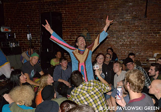 I was visiting some friends in Seattle last month. While having dinner in Capitol Hill at Lost Lake, they casually asked me what I wanted to do that night. I of course asked what bands were playing in town. My friend Kerry pulled out her iPhone and began to list bands, when she suddenly mentioned The Evaporators who happened to be playing that night right around the corner at The Comet Tavern. I stopped her from listing any other bands. That was it. Nardwuar was in town and I happened to be a block away! We finished our hearty meals, headed out into the kind of rain I hadn't seen since I moved down to LA and headed all the way around the corner to see The Evaporators play.